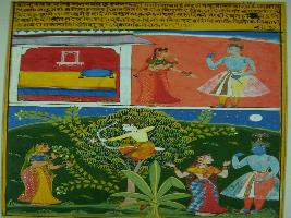| Description / विवरण | Miniature painting based on Rasikpriya depicting at the upper part Krishna talking to a gopi. At the lower part Krishna is talking to a gopi about Radha. Radha is standing behind a tree and Kamdev is aiming the arrow of love on her from sitting on that tree. |