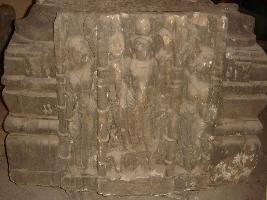 | Description / विवरण | An independent of four armed Shiva standing in dwibhanga pose. Attributes from right below. i missing, ii trident, iii snake, iv missing. Head of Nandi is seen behind his leg and is flanked by two female chauri bearers. |