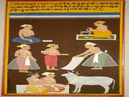 | Description / विवरण | Miniature painting based on Sarangadhar, on the top a man is depicted preparing gold ornaments, in the centre a man is depicted spreading a cloth on ground for two people, in the lower part two men are depicted sitting in front of a cow. |