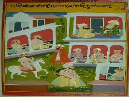 | Description / विवरण | Miniature painting depicting Akbar and Mullah-do-Piyaja talking. On the lower part is the street scene. |