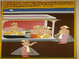 | Description / विवरण | Miniature painting based on Sarangadhar, on the upper part a king is depicted sitting with three men and in the lower part a man is depicted praying. |