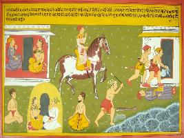 | Description / विवरण | Miniature painting based on Mahabharat - Rajdharma parva depicting a man sitting with his wife in a house at upper right part. Below this, a sage is depicted meditating. To their left, man is shown sitting with women. To their left, sage is shown sitting. At the lower left, man is shown hitting. At the upper left, two men is shown killing a man and then running away. At the upper middle part, a man is shown riding on horse. |