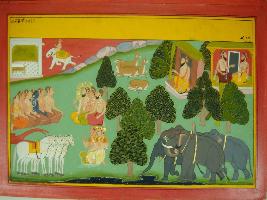 | Description / विवरण | Miniature painting based on Mahabharat - Vana parva. This painting shown Pandavas and Draupadi is travelling to forest t Agastsya rishi is shown sitting in his house and one of his disciple is coming to him. At the lower left part, elephants are shown drinking water from river. At the right part, Pandavas and Draupadi are shown sitting with Agastsya Muni and other s sages in his Ashram. Horse chariot is depicted at the lower right part. At upper right, Indra is depict riding on Parvat. |