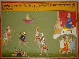 | Description / विवरण | Miniature painting based on Kashi khand, depicts a war between few tribes and in pot corner, a demon king seated with his two attendants. |