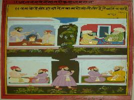 | Description / विवरण | Miniature painting depicting Mullah-do-Piyaja telling that a man should meet desire like a person stirring in the handi. |