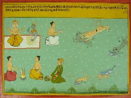| Description / विवरण | Miniature painting based on Mahabharat - Rajdharma parva depicting law of forest that one who is strong would dominate weaker section. One can win the world through violence. They only can perform yajya. At the upper right part, Brahma is shown sitting with Vishnu. Below this two sages are shown performing yagna. To their left a man is shown eating food. At the left part, tiger is shown killing dog, dog is shown killing cats, cat is shown killing rat, rat is shown killing rats. |