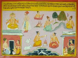 | Description / विवरण | Miniature painting based on Mahabharat - Rajdharma parva depicting that man should go to forest meditating. Trees, mountain and nature has life, sages used to live in forest and seek for medicine. Brahma is shown at upper right part. Man is shown coming. At upper left part, sages are shown sitting carrying stick. At the lower right part, man is shown sitting with women and child. At the lower left part, women is shown sitting with a child. At the middle lower part, two sages are shown performing yagna. Near by them swan, dog and fishes in pond are depicted. |