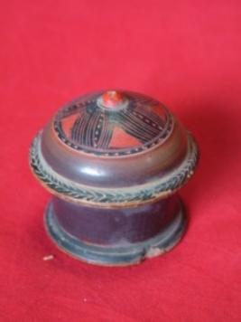 | Description / विवरण | It is a vermeilian wooden box. It has a dome shaped cover with pointed tip. Etched lines are visible on the cover and rim. |