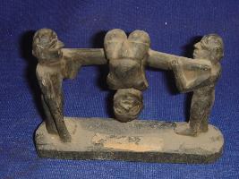 | Description / विवरण | Metal image of two men carrying a stick and in middle, man is shown performing aerobics by hanging upside down. |