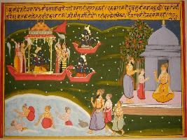 | Description / विवरण | Miniature painting based on Kashi khand depicting at the upper right Vishnu on a viman with four female attendants. At the left side sage Kardam with his son and a sage are depicted, the sage and his son are going to take bath in the water. Many sages are depicted taking bath in the water. |