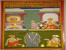| Description / विवरण | Miniature painting based on Sarangadhar. On the upper part a king is depicted, holding a granth. On the lower part two men are depicted holding granths and a hill in between them. |