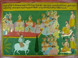 | Description / विवरण | Miniature painting based on Mahabharat - Sabha parva depicting after the departure of Krishna, Duryodhan and others are sitting near king Yudhisthir and at that time Vyas arives Pandavas are depicted praying him and Yudhisthir washing the feet of Vyas. Mahadev is depicted sitting on Nandi. |