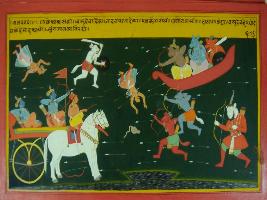 | Description / विवरण | Miniature painting based on Mahabharat - Vana parva depicting demons is killing the Yadavs and by seeing this Krishna is coming to fight with them. |