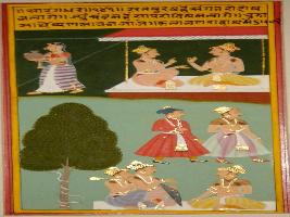 | Description / विवरण | Miniature painting based on Sarangadhar depicting philosophy of life. Three men are shown discussing that in the company of good men, evil can do no harm. company of good men is compared with sandal wood tree. At lower right part, snake is depicted over sandal wood tree. At the middle, two men are shown leaving. At the upper level, two men are shown discussing. To their right, a woman is shown carrying a vase. |