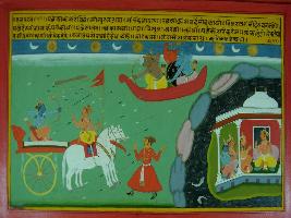| Description / विवरण | Miniature painting based on Mahabharat - Vana parva depicting Krishna fighting with Salbo, the demon without the conciousness of day and right. Many days passed by and the sun and the moon rises and set many times but the war do not stopped. At that time a messenger is coming says Krishna that Ugreasen is calling him to Dwarika. |
