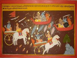 | Description / विवरण | Miniature painting based on Mahabharat - Vana parva depicting vigorous fight between Krishna and demon like Salbo, Maya, Seet, Ushan, Hina and Angara. |