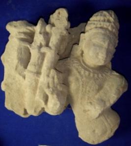 | Description / विवरण | Independent sculpture of Shiva. His body below waist and left arm are broken while his right hand is in Abhaya mudra. To his right some architectural design are seen. |