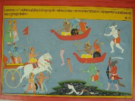 | Description / विवरण | Miniature painting based on Mahabharat - Vana parva depicting vigorous fight between Krishna and demon Salbo and other demons. Many demons died and their hands and legs are cutt off by the arrows of Krishna. |