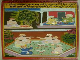 | Description / विवरण | Miniature painting depicting Mullah-do-Piyaja telling Akbar about six men who are sitting and reading holy books but in between they are boasting about themselves. |