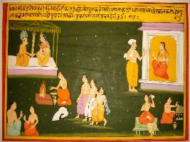 | Description / विवरण | Miniature painting based on Kashi khand depicting a man talking to a woman. A sage taking bath, the sage is depicted talking to a man, and the man is marrying the woman and the sage performing the marriage rituals and ceremony. |