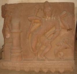 | Description / विवरण | An independent image of four armed Shiva in dancing pose. He is holding a trident in lower right arm and a kapala in upper left hand. The figure is duly ornamented and adorned with Jata mukuta. On his left a Shivgana is depicted in dancing pose and on right, Sardulya is seen. |