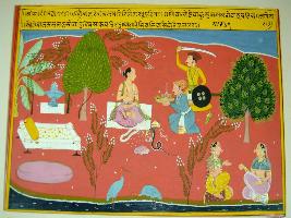 | Description / विवरण | Miniature painting based on Sarangatattva - an independent work of Sankhya school of philosophy depicting two women talking to each other at lower left part. They are discussing that different people behave differently. One person shown offering food to Brahman and other is coming to kill him with sword. At the extreme right, a Shiv linga and a bed are depicted. |
