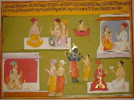| Description / विवरण | Miniature painting based on Kashi khand depicting Lord Vishnu telling Dhruv about the importance of worship in Kashi. He says that one who needs wealth can get wealth, one who needs child can get child and one who wants moksha can get red of life cycle, and all these can be achieved by worshipping in Kashi. |