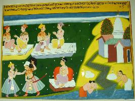 | Description / विवरण | Miniature painting based on Sarangatattva - an independent work of Sankhya school of philosophy. In the upper part, two groups of men are talking to each other, sitting separately. Below them, one man is seen preventing the other man who wants to attack him. One man is seen sitting near them. At the left side two men are seen taking bath in a river. |
