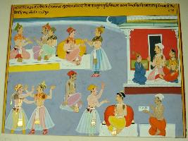 | Description / विवरण | Miniature painting based on Sarangatattva - an independent work of Sankhya school of philosophy depicting various scenes, a Raja is talking with his ministers. In the left corner of the painting the king is sitting with his queen and talking to a boy. |