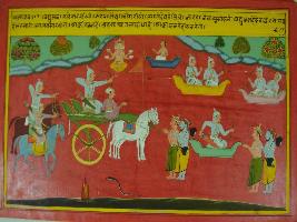 | Description / विवरण | Miniature painting based on Mahabharat - Vana parva depicting Pradunnya moving forward to kill Salbo, and on the way he meet, agni, snake and many Devtas including Narda. Devtas are discussing about the degradation of Salbo and Brahma predicts that Salbo will die in the hands of Krishna. |