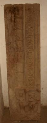 | Description / विवरण | Sculptured architectural fragment, part of a door jamb depicting floral designs. At the lower part a male and a female are depicted in different niches. The male figure has raised his hands upward while the female figure is holding a pitcher with both hands. |