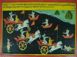 | Description / विवरण | Miniature painting based on Mahabharat - Vana parva depicting Pradumnya is fighting with Salbo and shot brahmastra then blood coming out from the body of Salbo. |