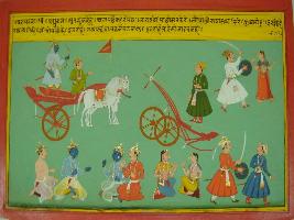 | Description / विवरण | Miniature painting based on Mahabharat - Vana parva depicting Pradumnya is telling the chariot driver not to take back his chariot in the war. On the upper left a man holding a sword to cut a woman. At the lower left another man is running after a man, holding a sword in his hand. Next to them two women are inconversation. |