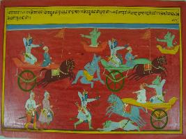| Description / विवरण | Miniature painting based on Mahabharat - Vana parva depicting Pradumnya is fighting vigorously with demonical army of Salbo. |