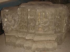 | Description / विवरण | Sculptured architectural fragment depicting a four armed goddess in lalitasana on low relief in between pillared niche. The goddess is holding child on her lap and other hand is in varada mudra while there standing human figure is seen in the some row that depicts in between separated pillar niche while towards extreme right there is the depiction of Krishna which is partly broken. |