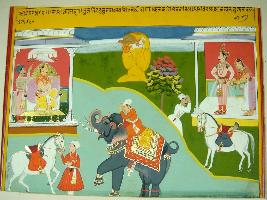 | Description / विवरण | Miniature painting based on Sarangatattva - an independent work of Sankhya school of philosophy depicting a king with a chauri bearer and thinking about a horse, a person brings a horse and presents it to the king and queen. Even the elephant salutes the horse. |