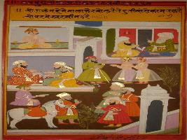 | Description / विवरण | Miniature painting based on Mullah-do-Piyaja. It depicts Mullah-do-Piyaja is telling Akbar that some people who always chanting in the name of god without doing daily works and duties, that is not the pure work. |
