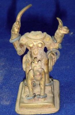 | Description / विवरण | Brass Durga having four arms and sitting upon lion. Attributes from below 1 Missing 2 Sword 3 Not clear 4 Chakra. The head of the deity is missing. |