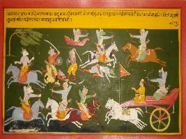 | Description / विवरण | Miniature painting based on Mahabharat - Vana parva. Pradyumna is depicted is on chariot while other fighters are depicted fighting on horse. Salwan is depicted fleeing from the battle at last. |