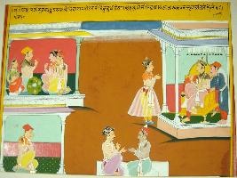 | Description / विवरण | Miniature painting based on Sarangatattva - an independent work of Sankhya school of philosophy depicting a scene of palace in which a king and queen are sitting with two men and having food. A king is shown in the upper left side. At the lower side two persons are talking to each other. |