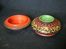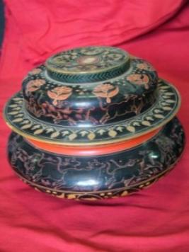 | Description / विवरण | It is a wooden concave shaped box with cover having ring shaped pedestal. It is etched with animals and human figures on the upper concave part and with incised lacquer work in floral pattern on lower concave part. |