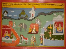 | Description / विवरण | Miniature painting based on Mahabharat - Vana parva. On the upper part of the painting is depiction of a temple. On the one side a king is depicted sitting in fort and Salva is comng to meet the king in viman, on the other side king is depicted in a camp with a man and in the centre horses and elephants are depicted. |