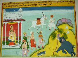 | Description / विवरण | Miniature painting based on Sarangatattva - an independent work of Sankhya school of philosophy. In the left side is a king sitting in a palatial balcony and in front of him four men, holding book, veena and glass are seen. In the right side, a man with a horse, an elephant breaking a tree and a deer are also depicted. |