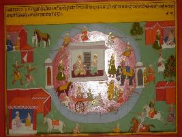 | Description / विवरण | Miniature painting based on Mahabharat - Vana parva. In the centre a king is depicted sitting with a man within fort and a king is depicted attacking the fort and the army within the for also depicted exchanging fire. The fort is surrounded by four tents in four cardinal direction, two men are sitting in each tent. |