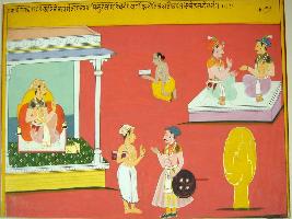 | Description / विवरण | Miniature painting based on Sarangatattva - an independent work of Sankhya school of philosophy depicting a king seated in his palace, a Purohit reading a sacred book, two royal persons talking to each other and seated on cushion. At the lower side, a soldier is talking to a Purohit. |