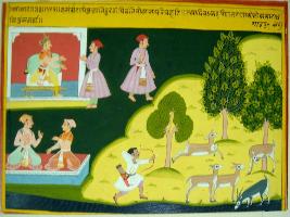 | Description / विवरण | Miniature painting based on Sarangatattva - an independent work of Sankhya school of philosophy depicting a king asking his minister to go to forest at the top right side. In the left, he is shown leaving. At the lower part, a man is shown hunting deer with bow and arrow. At the lower right part, two men are sitting and narrating the story. It is an incomplete painting. |