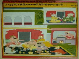 | Description / विवरण | Miniature painting depicting Mullah-do-Piyaja telling Akbar that to drink wine with low caste people is not permissible. |