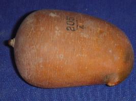 | Description / विवरण | Model of a mango, made of light weight wood and painted in brown colour with a hint of green at the top and the bottom. There are cracks all over and colours are flaking at one side. |