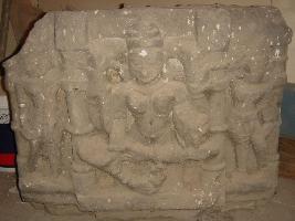 | Description / विवरण | Sculptured architectural fragment depicting a four handed goddess in lalitasana on high relief in pillared niche. The attributes from right below. i varada mudra, ii holding a club, iii mace, iv a pot. She has head gear and is adorned with necklace, tussels and girdle. On the other hand there is again two standing female figures whose faces are mutilated on both sides of the devi. |