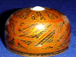 | Description / विवरण | Dome shaped wooden dice painted with lacquer paint, having floral designs and a circular base of black colour. At the top of the dice there is a tiny ivory fitting. |